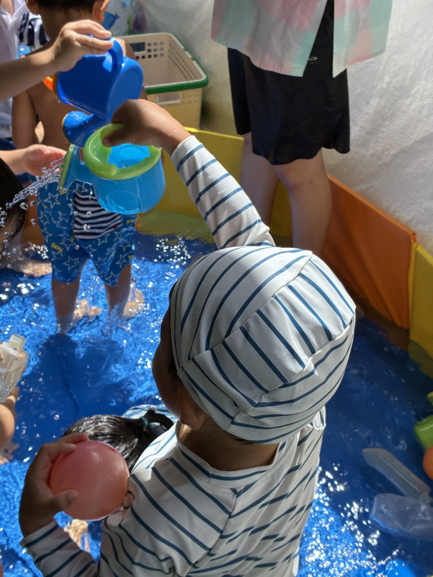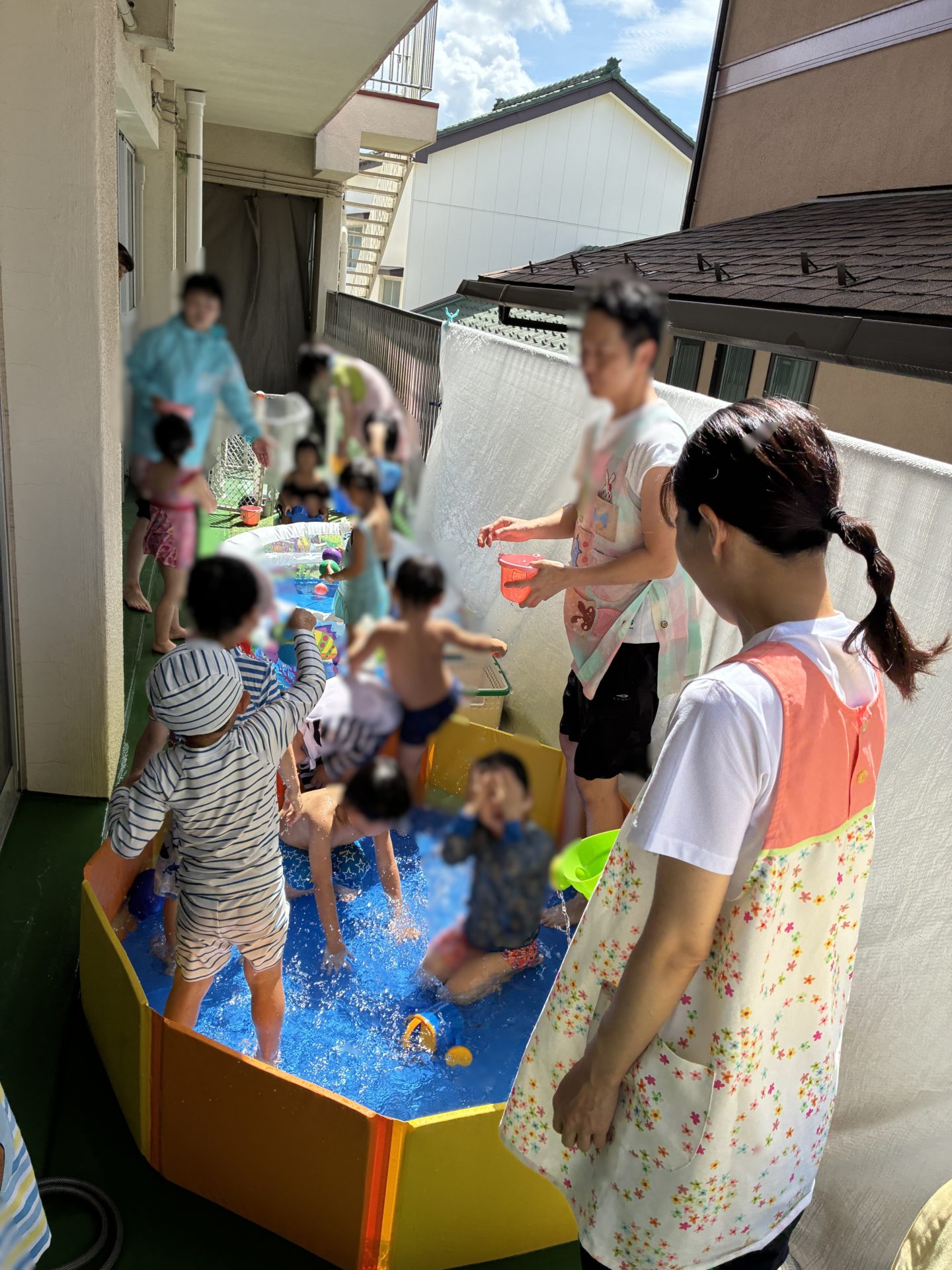 この日は、幼稚園の長~いベランダにプールを出して水遊び!